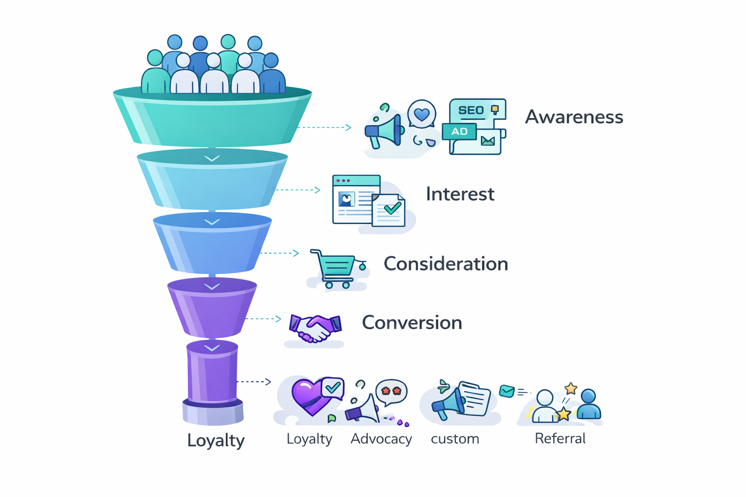 • Awareness – People first discover your brand through ads, SEO, social media, or content marketing.